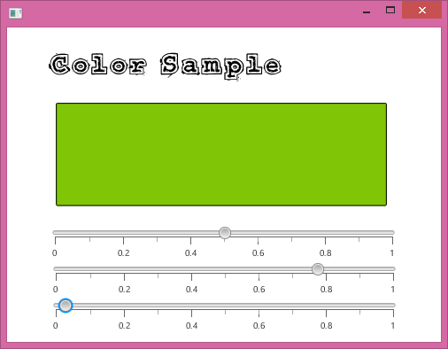 အထက်ပါ နမှုနာအား Run ကြည့်သောအခါ Slider များ၏ တန်ဖိုးအား ပြောင်းကြည့်သည့်အခါ အရောင်သည်လည်း ၎င်းတန်ဖိုးများနှင့် အညီ လိုက်၍ ပြောင်းလည်းသည်ကို တွေ့ရပါသည်။